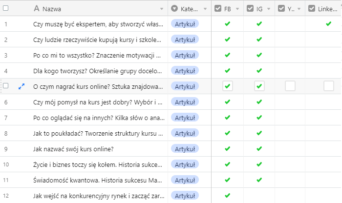 By efekty Twojej pracy nie poszły na marne, możesz przygotować zestawienie wszystkich zasobów, które już posiadasz, a następnie opisać je krótko i zaznaczyć, gdzie i w jakiej formie były już publikowane. Taką bazę treści możesz stworzyć na przykład w Airtable czy w arkuszu Google.