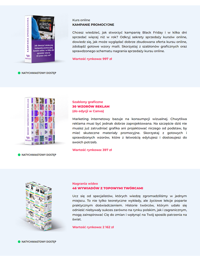 Tak wyglądał fragment ściany bonusów w jednej z ofert Web To Learn: