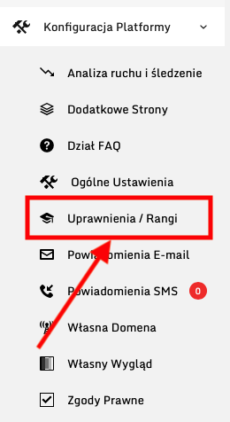 Aby dodać osobę, która będzie dodatkowym Twoim wsparciem po zalogowaniu się do panelu administratora, wejdź do Konfiguracja Platformy -> Uprawnienia Rangi.