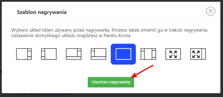 Po wybraniu odpowiedniego szablonu, kliknij „Uruchom nagrywarkę” aby zacząć nagrywać wydarzenie.