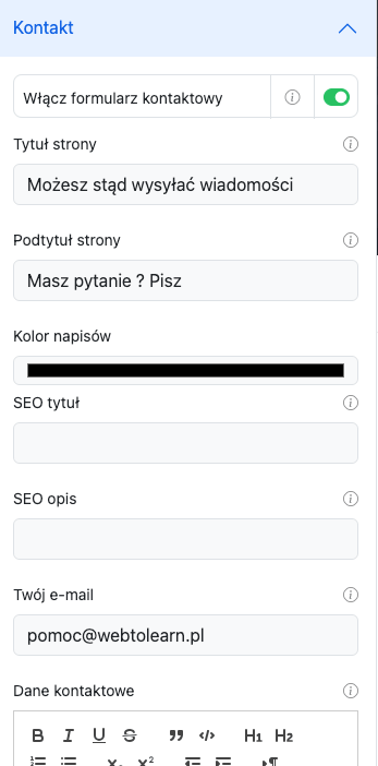 Jeżeli chcesz aby przycisk w menu działał, musisz włączyć też stronę kontaktu tutaj i uzupełnić wszystkie najpotrzebniejsze informacje.