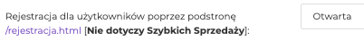 Rejestracja dla użytkowników poprzez podstronę /rejestracja.html – w tym miejscu wybierasz czy możliwość rejestracji poza formularzem zakupu Szybkiej Sprzedaży ma być otwarta czy zamknięta. Jeżelu wybierzesz, że opcja ta ma być otwarta to użytkownik będzie mógł się zarejestrować do platformy i dopiero w platformie zobaczyć produkty i je zakupić. Jeżeli zamkniesz opcję rejestracji, nie będzie takiej możliwości i jedynym miejscem utworzenia konta będzie formularz Szybkiej Sprzedaży.