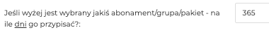 - Jeśli wyżej jest wybrany jakiś abonament/grupa/pakiet – na ile dni go przypisać? – Wpisujesz tutaj ile dni użytkownik może mieć dostęp do danego szkolenia. Bardzo częstym zabiegiem stosowanym przez Twórców, jest stworzenie abonamentu podstawowego i przypisywanie go każdemu użytkownikowi na okres np. 5/10/15 lat. Ma to na celu zmotywowanie klienta, któremu skończył się wykupiony okres, do zakupu również innych szkoleń, do których nie ma dostępu, ale widzi je na pulpicie.