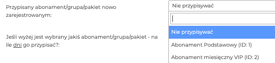 - Przypisany abonament/ grupa / pakiet nowo zarejestrowanym – jeżeli wyżej włączyłeś, że rejestracja jest otwarta, tutaj możesz wybrać czy przypisać abonament użytkownikowi oraz jaki to abonament. Przydaje się to w momencie kiedy masz darmowe materiały i chcesz umożliwić użytkownikowi rejestrację w celu korzystania z tych darmowych materiałów.