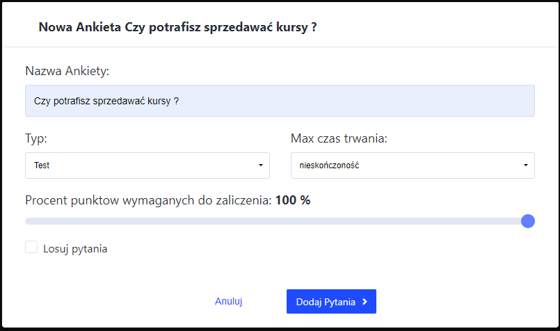 Aby dodać Test należy z pola wyboru wybrać opcję „Test” oraz zaznaczyć ile procent uczestnik musi zdobyć, aby zdać.