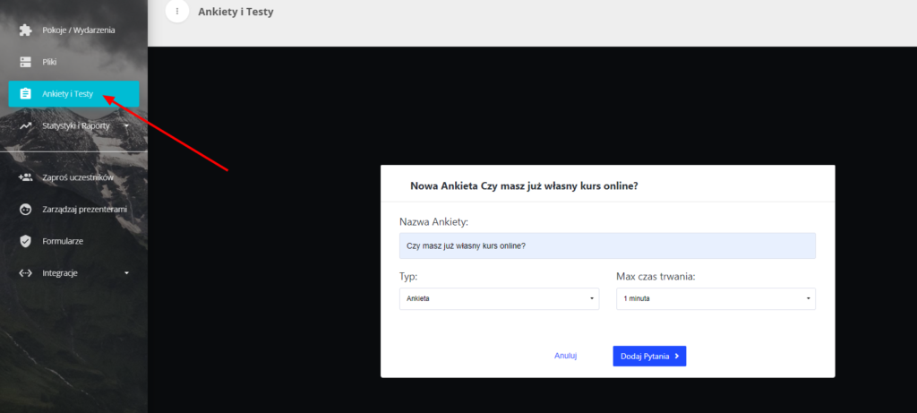 W zakładce „Ankiety i Testy” możesz stworzyć swoją własną ankietę lub test, które będą wykorzystane na Twoim Webinarze.