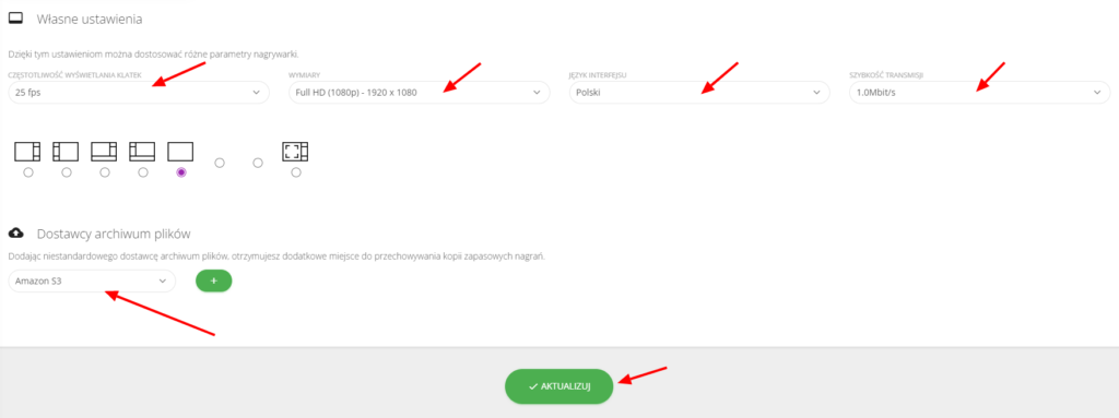 Wyświetlą się ustawienia, które możesz odpowiednio zmieniać, jest to zależne od tego jak dobry internet posiadasz. Możesz zmienić tutaj częstotliwość wyświetlania klatek, wymiary oraz szybkość transmisji.