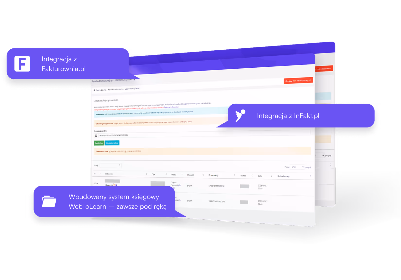 Zintegruj swoją platformę z Fakturownią, InFaktem lub korzystaj z naszego wbudowanego systemu WebToLearn – wybierz to, co dla Ciebie najwygodniejsze.